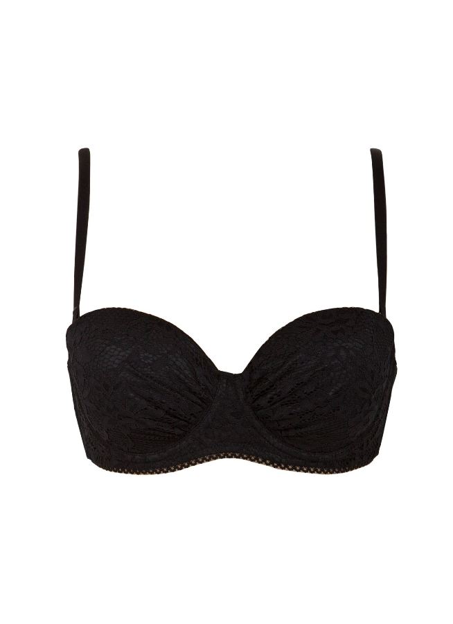 Black lace bra with removable straps. It has an extra cushion on the inside. You'll want to wear it again and again because of its comfort.